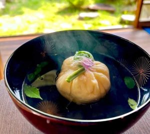 庭の東屋にて李朝席、大島邸広間にて懐石(日本料理ひら田)、